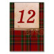 Cartão de número de tabela de aparência recepção de casamento antigo feito no padrão clássico de xadrez Real Stewart tartan vermelho, verde, azul, amarelo e branco. Gráficos de uma área de texto de papel antiga, com cordas e arcos de aparência de couro, na parte inferior. Personalize o número de cada mesa na sua recepção. Produtos de casamento correspondentes disponíveis.