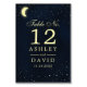 Número da Mesa de Casamento Lua Estrelas Azul Meia-Noite Celestial. Este design apresenta luzes de estrelas cintilantes com uma lua crescente brilhante no céu noturno estrelado.