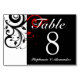 Adicione seu texto especial a este preto e branco com design de espiral reversa vermelha. Excelente como um cartão de mesa de casamento marcador de lugar para os convidados. Fundo preto com videiras brancas e espirais em um tema contemporâneo de na moda. Plasschaert Design Copyright © www.CustomInvitesOnline.com.