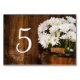 Adicione um toque de charme à decoração do seu chá de panela casual, mas clássico, de festa de celeiro ou recepção de casamentos com o Balde de Wooden rústico e os Números de Tabelas de Casamento do País das Díssias Brancas. Esta fazenda informal e elegante, ou tipo rancho, apresenta uma fina fotografia floral de um balde de madeira repleto de flores margaridas brancas e de um fundo de madeira de cascata castanha.