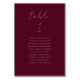 Esta elegante e moderna carta de números da mesa de casamento mostra a palavra "mesa" em um guião de escrita dourada em fundo burgundy. Adicione os nomes dos seus convidados que são atribuídos a cada mesa em fontes sans serif douradas.