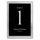 Uma borda prateada com fundo preto e carta branca de número da mesa de casamento que pode ser personalizada com qualquer número de tabela. Os gráficos aparecem em ambos os lados desta placa.