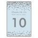 Design de casamento elegante com o Silver Faux Glitter Confetti Ice Blue e o texto personalizado do número da tabela.