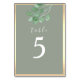 Cartão de número de mesa de casamento elegante em verde sálvia com folhas de eucalipto em aquarela e caligrafia minimalista. Perfeito para casamentos inspirados na natureza, este design combina perfeitamente com recepções modernas boho ou rústicas.