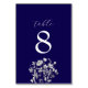Elegante e moderno, este número de mesa de casamento azul real apresenta ilustrações florais prateadas delicadas e caligrafia graciosa para um toque atemporal. Perfeito para recepções de casamento de inverno ou formais, adiciona estilo refinado e ajuda os convidados a encontrar seus lugares com facilidade.