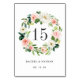 Cartão Elegante de Número de Mesa de Casamento com uma coroa de flores aquáticas, em cor rosa-claro e branco-esbranquiçado, com folhagem e folhas verdes. Para personalização mais avançada deste design, clique no botão "Personalizar". Itens correspondentes também estão disponíveis.