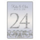 Esta design de mesa moderna de placa de apresenta sotaques falso de brilho prateado com fundo periwinkle. Perfeito para casamentos elegantes e modernos. As placas de números da tabela chegam a 30.