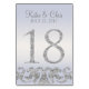 Esta design de mesa moderna de placa de apresenta sotaques falso de brilho prateado com fundo periwinkle. Perfeito para casamentos elegantes e modernos. As placas de números da tabela chegam a 30.