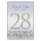 Esta design de mesa moderna de placa de apresenta sotaques falso de brilho prateado com fundo periwinkle. Perfeito para casamentos elegantes e modernos. As placas de números da tabela chegam a 30.