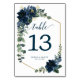 Ajude seus hóspedes a encontrar facilmente o caminho com estes bonitos cartões de números de mesa duplos. Edite facilmente os números, nomes e data! Este design apresenta um belo buquê floral de marinho arrojado e uma fonte elegante de script! Veja toda a coleção de Marinhos reais para mais itens correspondentes!