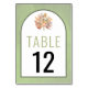 Folhas de palma secas tropicais, gramíneas pampas e flores de protea salgam número de mesa de casamento verde. Esta adorável design de casamento apresenta um quadro de arco em fundo verde manchado. No quadro há um buquê de palmeiras secas, flores de proteína e gramíneas-pampas.