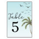 Este cartão de número da mesa de casamento apresenta um tema tropical para um destino ou um simples casamento na praia. Imagem à direita de uma palmeira, com um bando de pássaros voando acima. O fundo é um gradiente azul-céu.