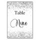 O número da mesa é escrito com um estilo de letra elegante à mão. Letras pretas, fundo branco na frente e fundo prateado falso com pó de brilho falso, brilhos nas costas.