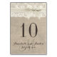 Esta placa rustic table number apresenta um fundo de aparência de burlap com uma imagem impressa de local e fita. Perfeito para um casamento ou recepção temáticos. Coordena-se com nossa linha de cheio de produtos Rustic Burlap e Lace.