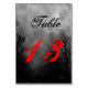 Um cartão de mesa de dois lados, personalizado, com texto de script verde na frente e atrás e arte de um céu de Halloween assustador com árvores negras ao longo de uma rua assombrada escura, corvos góticos e uma lua de cheio nublada em preto, branco e cinzas. Personalize-o para alterar fontes, cores e até salvar seu design para mais tarde.