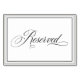 Um cartão de mesa reservado simples e elegante para mesas na sua recepção ou banquete que você deseja reservar para assentos especiais. Uma fronteira de cinza prateada rodeia o simples cartão branco com uma caligrafia elegante que soletra a palavra "Reservado"