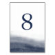 As placas de número de tabela chic costeiras em tons de azul e branco profundos de marinho apresentam uma lavagem com aquarela na parte inferior que evoca a borda e o fluxo da maré. Design repete-se no lado oposto. Coordena-se com a nossa suíte de convite para casamento de Marinhos.