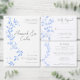 Elementos: uma videira elegante no estilo da pintura de porcelana vintage. Os nomes aparecem em um script moderno; outros detalhes em fontes clássicas de serifa Cores: azul, azul de porcelana, azul delft, azul francês, cinza. Temas: elegante, moderno, minimalista, jardim, sutil, leve, areia, eterno, safra. Coleção: Mínimo Elegante Porcelain Floral Chinoiserie Tipo de Produto da Coleção de Casamentos: Cartão de Mesa