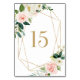 Quadro de Primavera de Aquarela Geométrica Número 15 | Número de mesa elegante e feminina com ilustrações em aquarela de rosas e peões brancas, cor de pêssego e cor-de-rosa, sotaques folínicos e quadros geométricos de folhas falsas. Este número de mesa floral é perfeito para eventos de primavera e jardim.