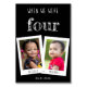 Uma maneira moderna e mais original de personalizar os números da mesa com fotos da infância da noiva e do noivo na idade daquele número (o padrão é quatro). As fotos de espaço reservado de uma menina (a noiva) e um menino (o noivo) têm bordas brancas retrô, sobrepostas, na metade inferior. Os nomes da noiva e do noivo estão escritos nas bordas brancas inferiores das fotos. Na parte superior, há a mensagem "quando tínhamos quatro anos" com a idade escrita em letras grandes e brancas, como giz, e o resto acima, em letras maiúsculas brancas menores (letras manuscritas). Na parte inferior, sob as duas fotos, há a data, também escrita como em giz branco. O fundo é preto.