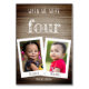 Uma maneira moderna e mais original de personalizar os números da mesa com fotos da infância da noiva e do noivo na idade daquele número (o padrão é quatro). As fotos de espaço reservado de uma menina (a noiva) e um menino (o noivo) têm bordas brancas retrô, sobrepostas, na metade inferior. Os nomes da noiva e do noivo estão escritos nas bordas brancas inferiores das fotos. Na parte superior, há a mensagem "quando tínhamos quatro anos" com a idade escrita em letras grandes e brancas como giz e o resto acima, em letras maiúsculas brancas menores (letras manuscritas). Na parte inferior, sob as duas fotos, há a data, também escrita como em giz branco. O fundo é uma textura de madeira escura.