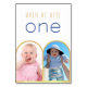 Uma maneira moderna e mais original de personalizar os números da mesa com fotos da infância da noiva e do noivo na idade daquele número (o padrão é um).As fotos de uma menina (a noiva) e um menino (o noivo) estão em molduras de arco de ouro falso, na metade inferior. Na parte superior, há a mensagem "quando tínhamos um ano" com a idade escrita em azul-marinho e o restante acima, em letras maiúsculas douradas menores (letras à mão).