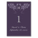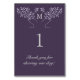 Uma carta de número da mesa de casamento moderna com uma ilustração de árvore da vida composta por dois ramos de árvore envolvidos. Folhas de lavanda sobre fundo roxo escuro com monograma.