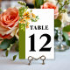 Ramo de rododendro com cartão de número de mesa com flores amarelo laranja. Eleve a sua recepção de casamento com este cartão de número de mesa lindamente desenhado, apresentando um delicado ramo de rododendro em aquarela adornado com flores laranja-amarelo e folhas verdes. Posicionado no canto superior esquerdo, a ilustração botânica cria um ponto focal romântico e atraente. Uma borda verde-oliva ao longo do lado esquerdo adiciona um toque refinado de elegância, enquanto a tipografia ousada e elegante garante uma excelente legibilidade.