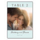 This wedding table card features a soft, romantic design with a vertical layout. The top section displays the table number in bold uppercase letters against a pale mint green background, while the central area showcases a large photo placeholder of two people close together. Below the image, elegant script font highlights customizable names, and a smaller serif font presents the date. The color palette combines warm tones from the photograph with cool mint accents, creating a cohesive and intimate look perfect for weddings. The minimalist style emphasizes simplicity and elegance, making it ideal for adding a personal touch to your special day.