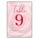 This wedding table card features a soft, romantic design with a large pink rose as the central motif. The color palette includes delicate shades of pale pink and white, complemented by deep red text for an elegant contrast. The layout is balanced, with "Table" written in cursive at the top and a bold numeral "9" dominating the center, while customizable names and dates are neatly placed at the bottom. The overall style exudes sophistication and warmth, making it perfect for creating an intimate and refined atmosphere at your special event.