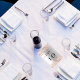 Um fundo prateado falso decorado com faíscas rosa douradas. Personalize e adicione seus números de tabela. Adicione seus números um a um.