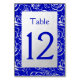 Um simples cartão de número de tabela com um motivo floral prateado em um rico fundo azul real. Você pode alterar a cor e o estilo da fonte no menu personalizar. Isto é parte de uma suíte de casamento correspondente que inclui um convite, menu e muitos outros itens.