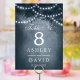 Acenda sua recepção de casamento rústica com esses números de mesa encantadores. Apresentando uma silhueta majestosa de árvore de floresta enfeitada com luzes de cordas cintilantes contra um pano de fundo azul sereno, esses números de mesa adicionam um toque de magia ao seu dia especial. Perfeito para comemorações ao ar livre ou interior, eles criam um ambiente quente e convidativo para seus convidados.