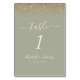 A borda superior deste elegante número moderno da mesa de casamento apresenta um design dourado faux glitter. O texto personalizável combina manuscrito de marfim, fontes em copperplate e itálico em um fundo verde de sábio.