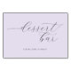 Este elegante sinal de mesa para casamento apresenta um design minimalista com um fundo suave lavanda e tipografia cursiva preta que diz "dessert bar". A fonte simples e limpa sem serifa abaixo convida os convidados a se deliciarem com a frase "PLEASE TAKE A TREAT!". O layout equilibrado enfatiza sofisticação e acessibilidade, tornando-o perfeito para criar uma atmosfera acolhedora em seu evento. Seu minimalismo moderno garante que ele complemente qualquer decoração, mantendo um tom suave e convidativo.