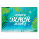 Design de festas de praia de verão com palmeiras e faíscas ao fundo.