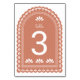 Este número romântico de mesa de arco apresenta uma delicada design que lembra as flores e as folhas que piscam. Seus convidados adorarão chegar à mesa deles para ver este charmoso sinal de mesa. A cor terra cotta cria um calor rico e sujo e é um complemento perfeito das cores naturais da temporada de outono. Um encantador complemento para a sua recepção de casamento mexicana ou sudoeste.