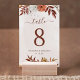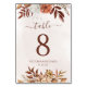 Números de mesa de casamento do estilo moderno da boêmia, com flores aquáticas e folhas de outono em tons sujos, como marrom-ferrugem, laranja queimado e terracota. Escolha perfeita para casamentos no outono.