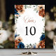 Elegante azul-Marinho, Terracotta, Terra-de-laranja, carta de número da mesa de casamento com buquê elegante de azul-Marinho, rosas de cor Terracotta e folhas verdes de eucalipto. Entre em contato comigo para obter ajuda sobre a personalização ou se você precisar de outro produto com este design.