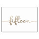 Cartão branco com texto dourado, placa de mesa de número 15/15 manuscrita.