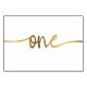 Cartão branco com texto dourado, placa de mesa número um manuscrita.