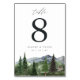 Adicione um toque de acabamento polido às suas mesas de recepção com esta placa de número de tabela de 3,5x5" da coleção Timberline pela Redwood & Vine Design Co. Uma paisagem de aquarela exuberante de montanhas verdes e evergreens ancora o design, perfeito para casamentos rústicos, invernais ou ao ar livre. Personalize com seus nomes e data de casamento para um detalhe de evento coeso e memorável.