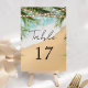 Elegant beach theme wedding table number featuring modern typography against a beautiful beach background.