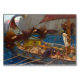 Ulisses e as sereias do pintor de Pré-Raphaelite John William Waterhouse, o petróleo na canvas 1891, retrata as perigosas belezas da mitologia grega cujas canções encantadoras atraíam a passagem de marinheiros para naufragos e a morte. O herói Ulisses (Ulisses) do poema épico de Homero, A Odisseia fez com que seus homens ligassem seus ouvidos com cera de abelhas e se jogassem no mastro de sua nave enquanto passava pela canção das Sirens. Waterhouse retrata as míticas sereias como enormes pássaros negros com lindas cabeças femininas enxameando sobre um brilhante mar de azure. Esta pintura reflete a ênfase dos pintores pré-rapelitas nas cores brilhantes e joias nos estilos de composição medieval e renascentista inicial, combinada aqui com influências pareadas das escolas do Romantismo e Impressionismo. John William Waterhouse (1849 - 1917) era pintor inglês da escola Pré-Raphaelite do final do século XIX. Depois de estudar na Academia Real de Arte Britânica, Waterhouse pintou cenas clássicas da antiga mitologia grega, adquirindo gradualmente os traços estilísticos dos Pré-Raphaelitas, bem como as qualidades parelhistas dos Impressionistas Franceses. Apesar de ofuscada pelos membros mais famosos da Irmandade Pré-Raphaelita, Waterhouse exibiu-se com sucesso no excelente e produziu muitas pinturas com temas de figuras femininas da mitologia e das lendas do Rei Arthur.
