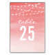 A design de casamento da Watercolor String Lights foi criada por EggPlant e Purple. Este design moderno inclui uma série de luzes com um espantoso fundo aquoso de cor de pêssego. Nota: Cada placa numérica da tabela deve ser personalizada e adicionada individualmente ao carrinho de compro.