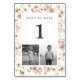 Modern, boho table number card features a modern serif font and delicate wildflowers in soft shades of blush pink, ivory, and green. The table number corresponds to the age of the couple and features black and white photos of them at that age. Create as many table numbers as you need by changing the "1" to your desired number, swapping the photos for your own, and add 1 item to your cart. Repeat for as many table numbers needed.