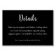 Texto branco sobre cartões de cerimônias de casamento pretos para "detalhes" ou outras informações como um link de site. Personalize usando a fonte moderna de script manuscrito em três locais. A área do site é impressa para leitura fácil. Adicione, remova e mude o texto para usar essas placas pequenas para qualquer fim. A cor de fundo pode ser alterada na área "personalizar mais".