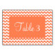 Coral e padrão de fevron branco com o número da tabela. Você pode personalizar o plano de fundo e a cor da fonte, bem como o estilo e o tamanho da fonte.