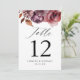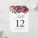 Elegante, outono, cartões florais de números das mesas de casamento com uma fronteira superior de flores aquáticas e folhagem em tons de marsala, burgundy, roxo, castanho e laranja complementados por um moderno roteiro de caligrafia. Para solicitar os cartões de mesa: adicione seu nome, data do casamento e número da tabela. Adicione cada número ao carrinho individualmente e faça check-out quando terminar. Projetado para coordenar com a nossa coleção de casamento Rustic Autumn Floral.