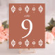 Este número mexicano da mesa casada Terra Cotta é inspirado pela bela arte popular do México e do sudoeste. Este simples número de mesa dupla é perfeito para o seu casamento no outono do México ou no sudoeste. A cor quente e úmida e a tipografia clássica criam um olhar moderno e rústico. Este número da tabela ajudará a tornar a sua recepção de casamento um evento elegante para se lembrar. Veja o resto da Coleção de Casamentos Terra Cotta Mexicana para ver itens mais perfeitamente coordenados para seu dia especial.
